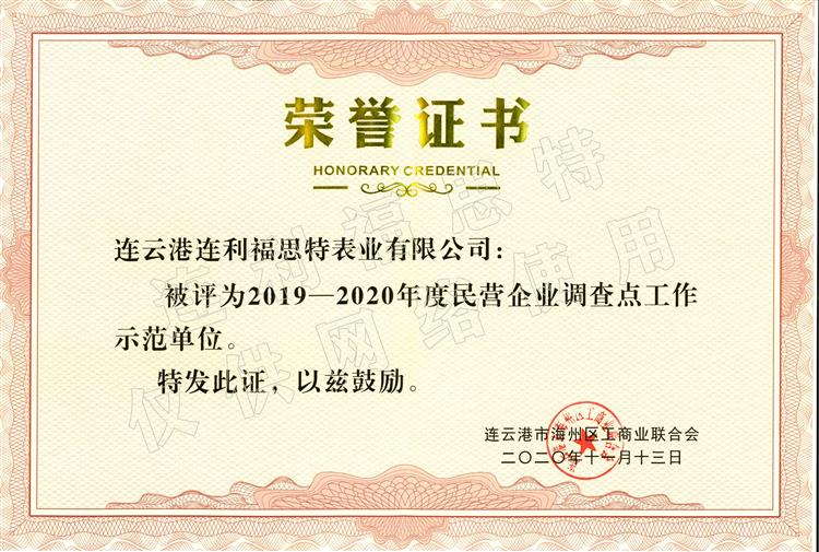 近日,連云港連利福思特表業(yè)有限公司榮獲“2019-2020年度民營(yíng)企業(yè)調(diào)查點(diǎn)工作示范單位”稱號(hào)。 民營(yíng)企...